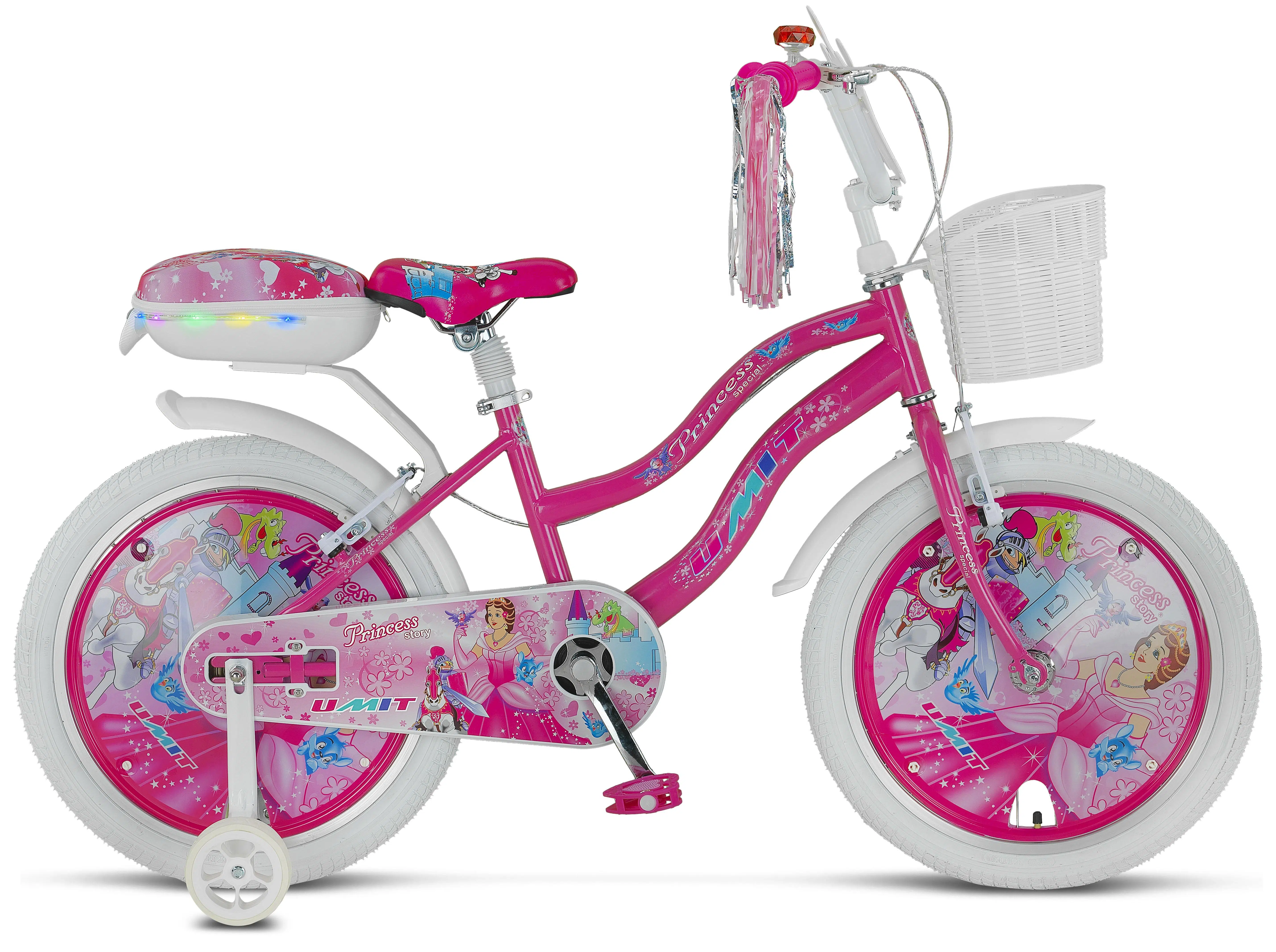 LED ışıklı Princess çanta • Prenses taç siperlikli jant kapağı • Plastik ön sepet • Gidon püskülü • Zil